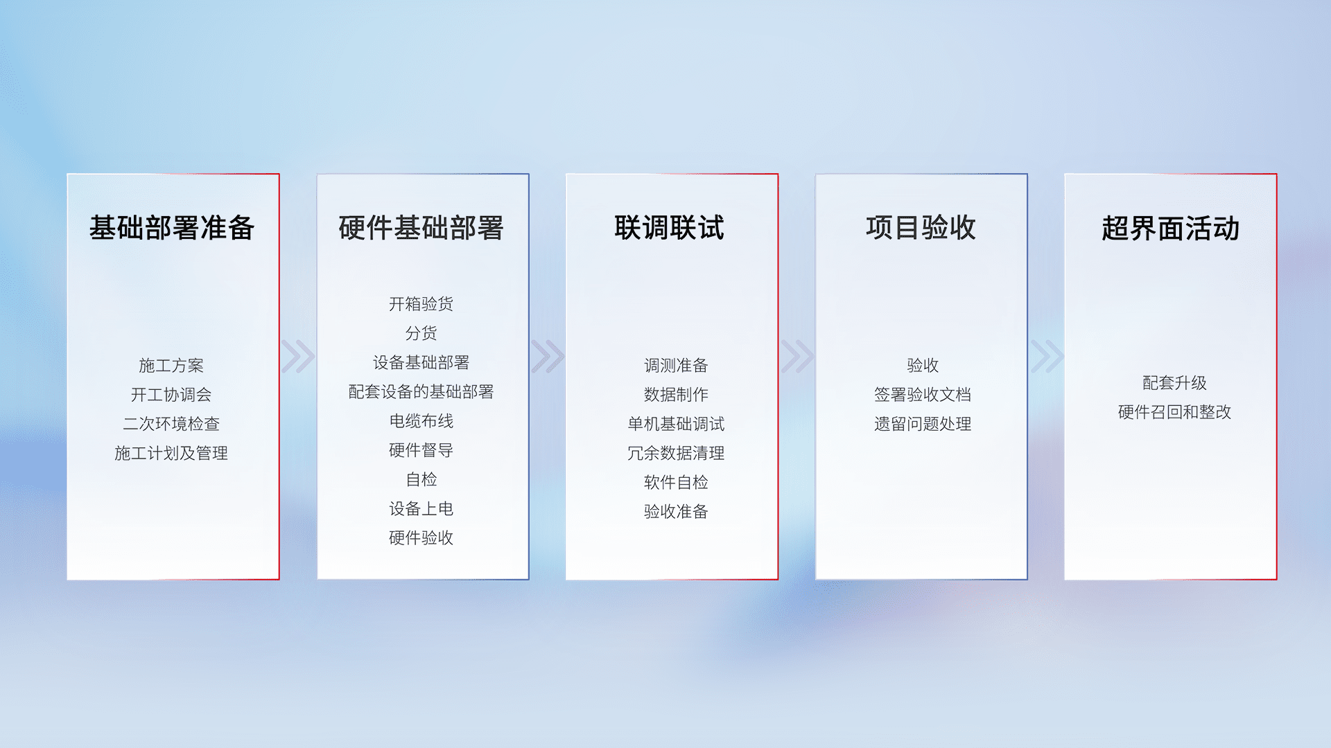 从基础部署准备、、、、硬件基础部署、、、、联调联试、、、、项目验收、、、、越界面活动的全过程可追溯,,保证施工质量和进度。。